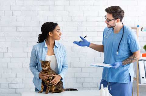 Veterinarian with cat and owner